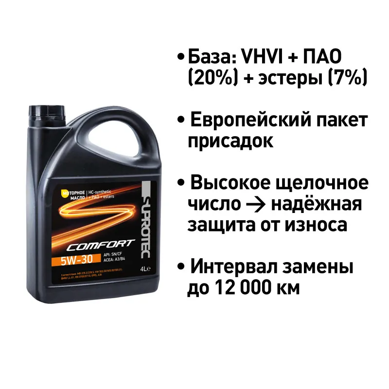 Масло SUPROTEC COMFORT согласно классификации ACEA: A3/B4, API: SN/CF разработано для современных высоконагруженных двигателей: