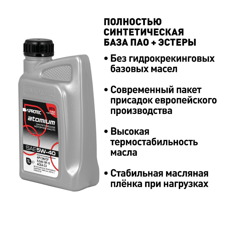 Масло SUPROTEC ATOMIUM согласно классификации ACEA C3, API SN, ILSAC GF-5 разработано для современных высоконагруженных двигателей: