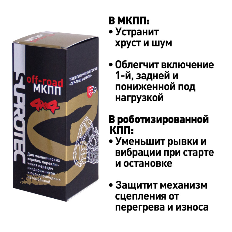 Состав «Off-road 4x4 МКПП» частично восстанавливает размеры и геометрию изношенных деталей, оптимизирует зазоры в парах трения, позволяет удерживать более плотный масляный слой на поверхности деталей.