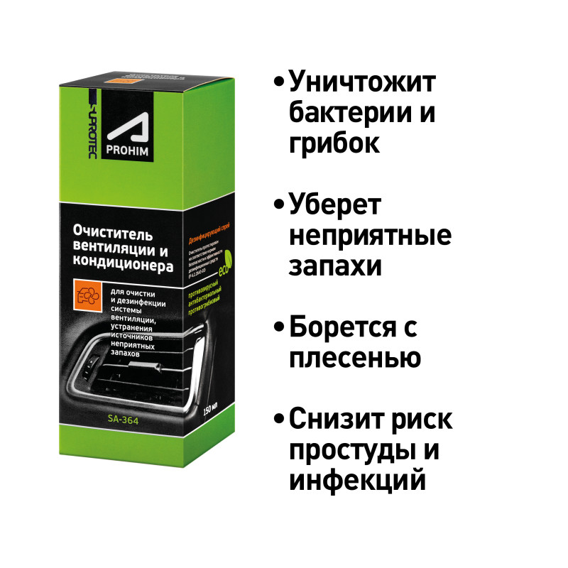 Очиститель вентиляции и кондиционера «Супротек» — это средство, которое уничтожает инфекционные загрязнения в системе вентиляции автомобиля: бактерии и грибки. Он также способствует уничтожению вирусов гриппа немедленно после их появления в салоне. Это обеспечивает ряд потребительских эффектов: